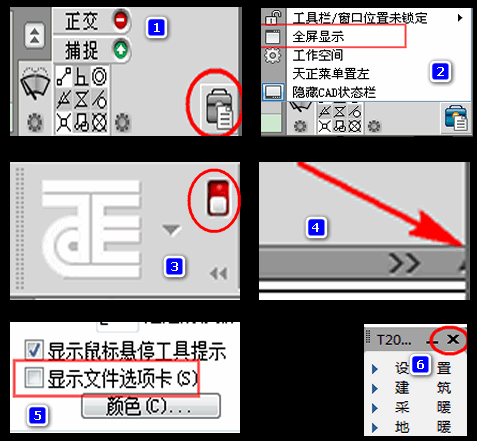 精简天正T20界面 扩大视图区域 12 月31 按照下图步骤一一设置: 1,点击设置按钮; 2,点击全屏显示; 3,点击按钮,使之处于红色状态; 4,在此工具栏最后右面有个小三角图标(不太容易看到); 5,在CAD选项设置不显示文件选项卡; 6,把T20的工具栏关闭。 这样视图区域就大了。